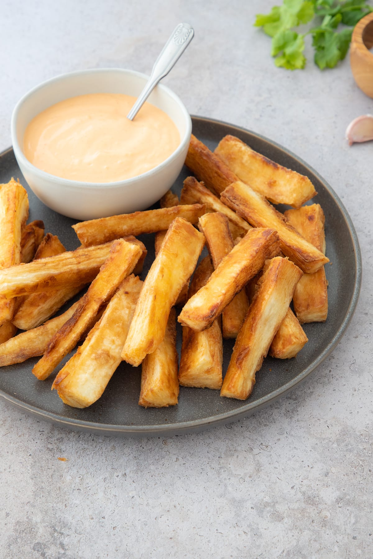 2. Place yuca into a medium-sized pot. Pour in water and salt. Bring to a boil and cook over medium-high heat for 15-20 minutes, or until tender (test by poking with a fork). Remove the yuca from the water.