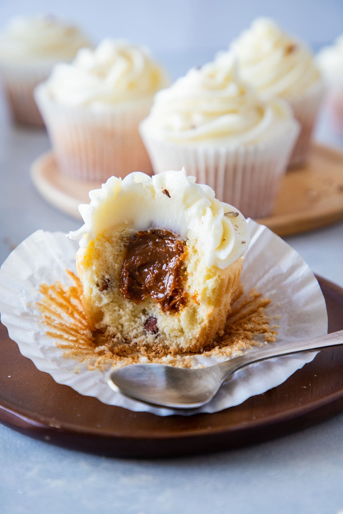 “Sweet and moist almond cupcakes are filled with creamy dulce de leche and topped with a delicious cream cheese frosting. Simple and easy to make, they are perfect for any occasion!”