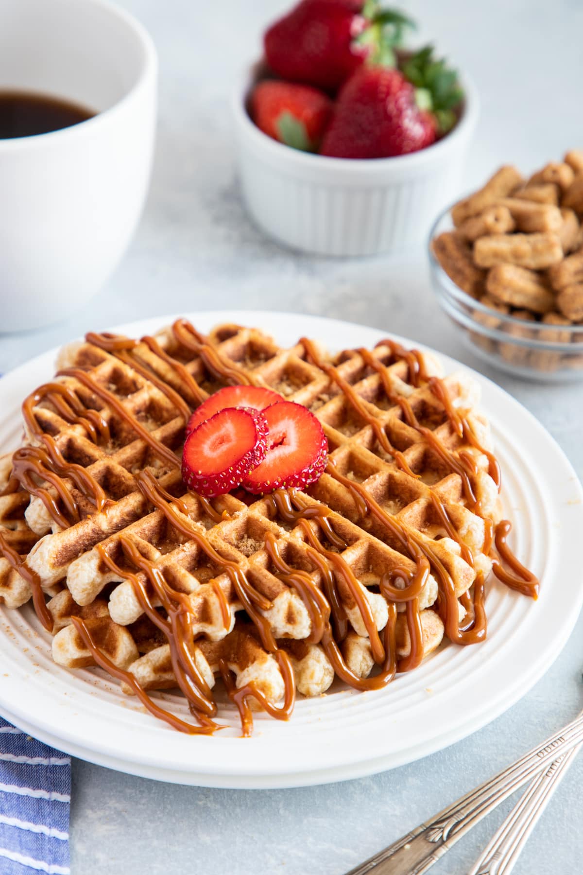 Start your morning off right with our delicious Cinnamon Toast Crunch Churros Waffles Recipe topped with Dulce de Leche. The ultimate breakfast indulgence!