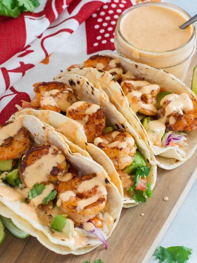 Made with saute shrimp, slaw, avocado, tomato- jalapeño salsa, and topped with a pineapple chipotle sauce. These shrimp tacos are a fast and flavorful weeknight dinner with a sweet and spicy kick.