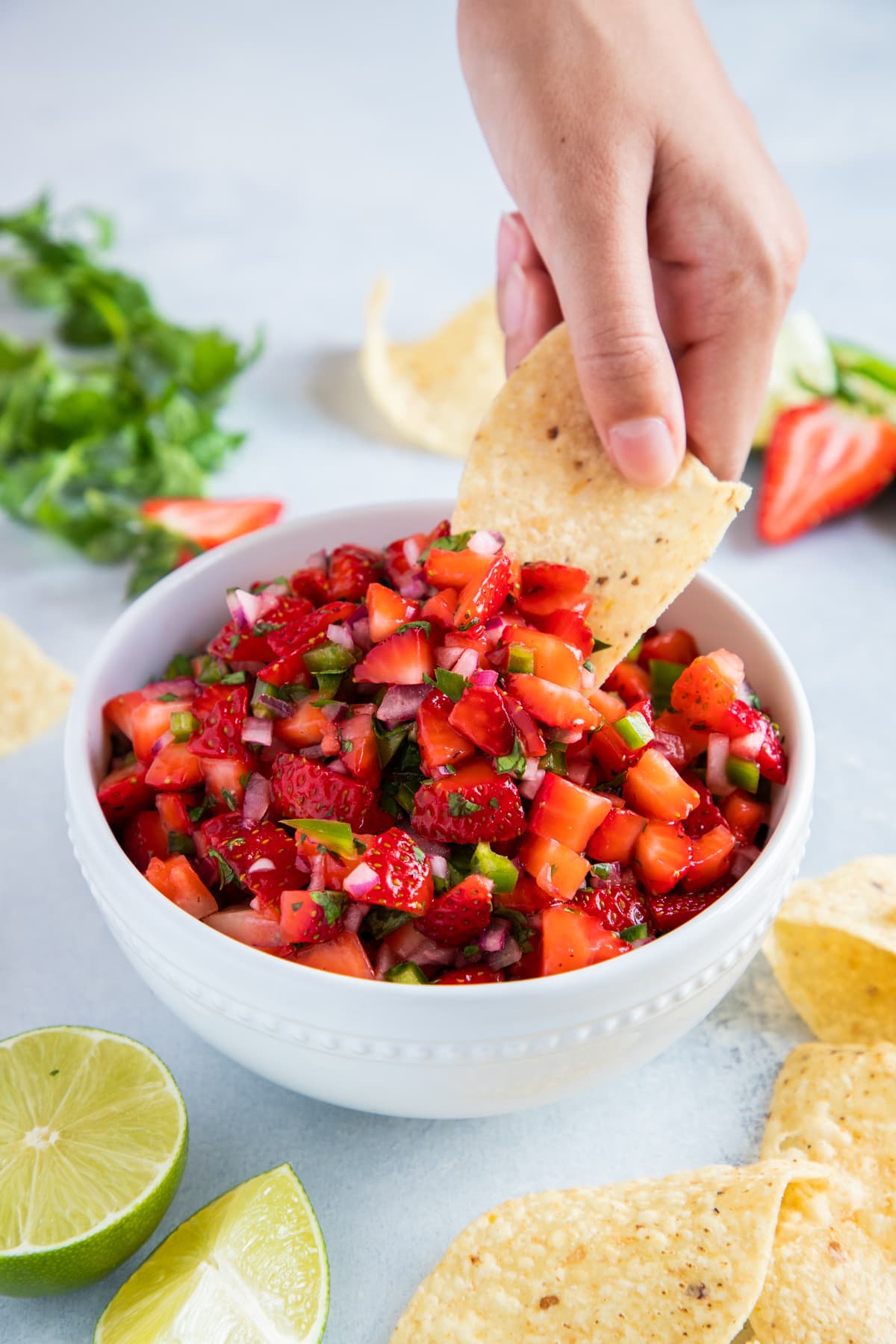 1. Dice strawberries, onion, and jalapeño into small cubes and place in a large bowl. Add chopped fresh cilantro, lime juice (freshly squeezed is best), and salt and pepper to taste. Stir everything together to combine.